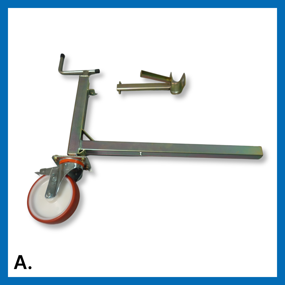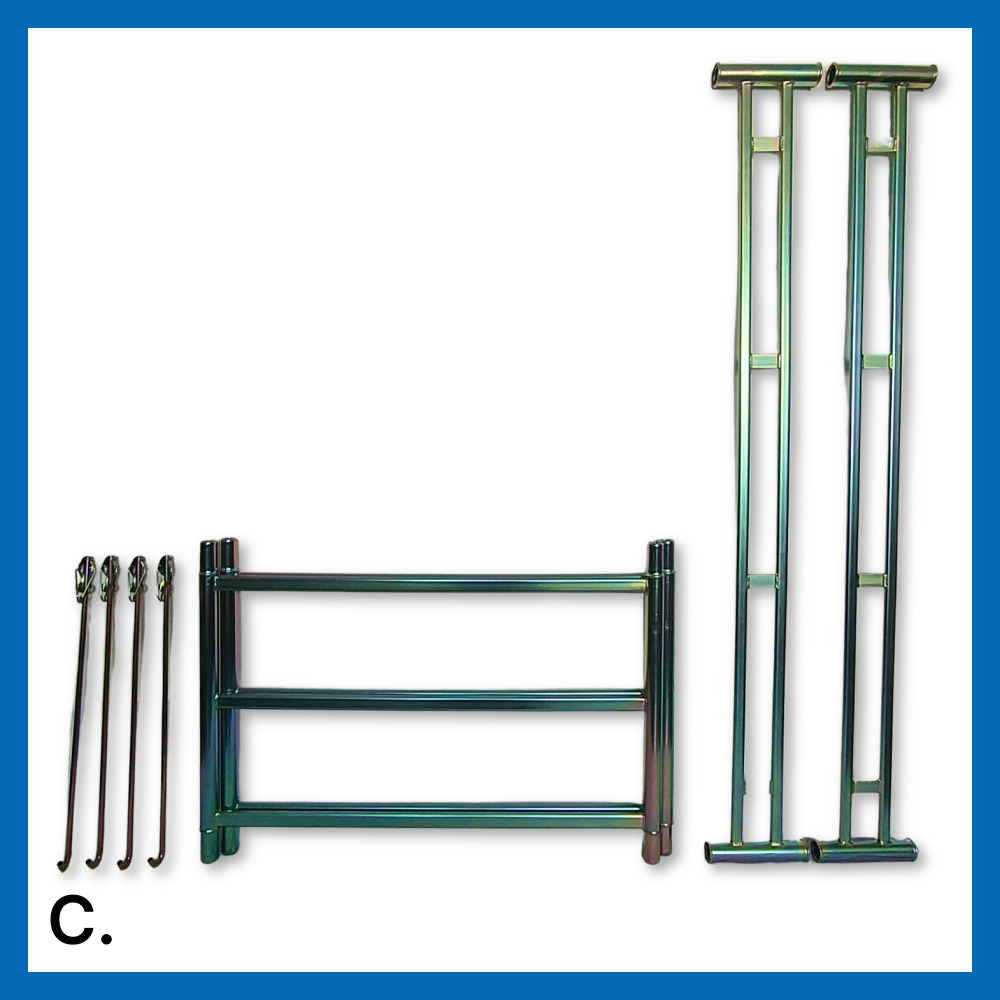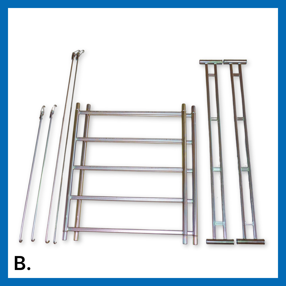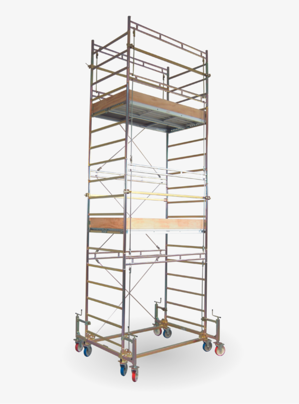 Costruito con tubi in acciaio zincato, si compone di elementi scala verticali (montanti sezione tonda ø 48 mm e gradini sezione rettangolare 40×20 mm antiscivolo) e di elementi orizzontali di giunzione a sezione doppia ovale 30×15 mm. Facile da trasportare, leggero, pratico e sicuro.